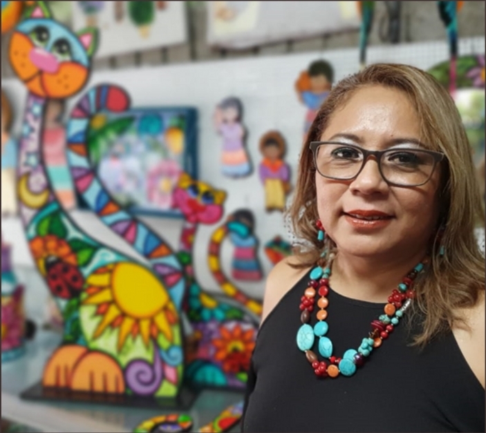 Salvadoreña de 49 años, madre y propietaria de Papalote Azul, tienda de artesanías y academia de manualidades. Mónica es licenciada en Diseño Artesanal de la Universidad Doctor José Matías Delgado, a lo largo de su carrera ha participado como instructora en diferentes programas de ayuda a la comunidad, como Monitora y diseñadora de productos para jóvenes de escasos recursos con FUCAD, Fundación Montecristo en cantón la Preza de Santa Ana, en el proyecto pro- jóvenes  de El Salvador, patrocinado por la Unión Europea, talleres de innovación de productos artesanales con el uso de coco, morro y elementos marinos en la zona de la Libertad, con el patrocinio de CONAMYPE, entre otros. Ha trabajado también en academias de arte, con instituciones de gobierno y empresas privadas, manejando distintas técnicas como repujado, elaboración de velas, pintura acrílica, óleo, acuarela, pintura en tela, pasta fría y muchísimas otras técnicas de manualidades.