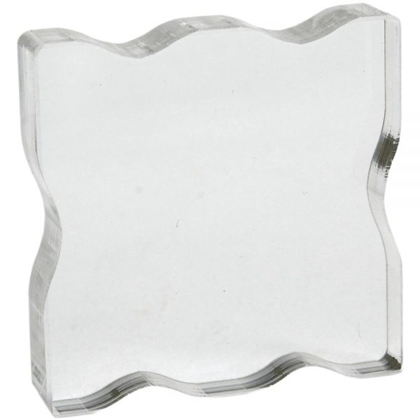 Bloque de acrílico 2 1/4 x 2 1/4 in y 1/2 in de grosor con agarre de dedos redondeados. La ventaja de ser acrílico es que se puede observar directamente donde se está colocando el sello en el área de trabajo.